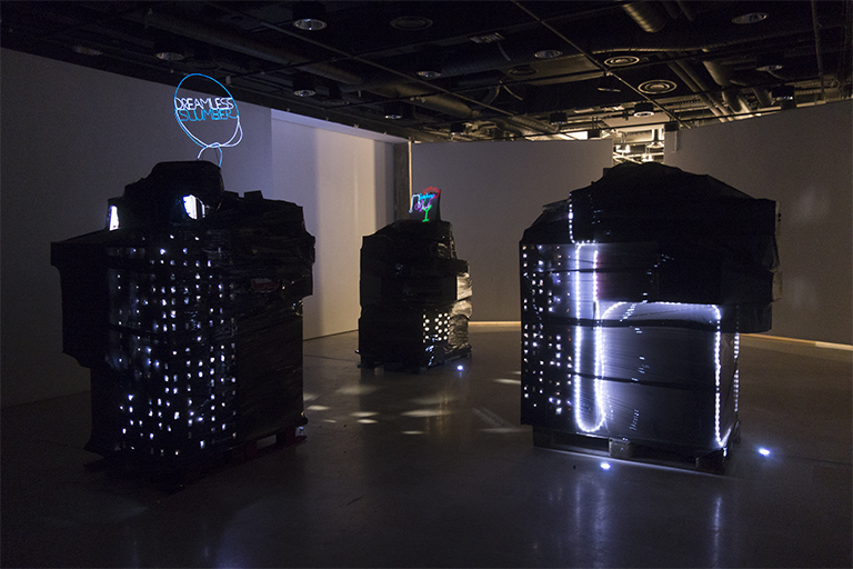 Je travaille l’installation et la vidéo de manière transversale. J’ai recours aux automates, au field recording video ainsi qu’à la récupération d’objets en milieu urbain pour mettre en scène des espaces immersifs, désertés par l’humain et dont certains éléments deviennent acteurs de la fiction qui s’y installe.