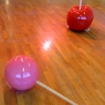 Pomme d’amour, Polystyrène, vernis, acrylique, bois, 1m20 – Sucettes, Polystyrène, vernis, acrylique, bois, 1m50.
